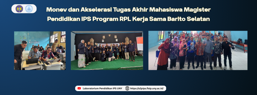 Program Magister Pendidikan IPS Universitas Negeri Yogyakarta (UNY) menyelenggarakan kegiatan Monitoring dan Evaluasi (Monev) serta Akselerasi Tugas Akhir bagi mahasiswa Program Rekognisi Pembelajaran Lampau (RPL) kerja sama Kabupaten Barito Selatan pada Kamis, 20 November 2025, di Buntok. Kegiatan ini bertujuan untuk memastikan mutu akademik sekaligus mempercepat penyelesaian studi mahasiswa sesuai standar kualitas UNY.